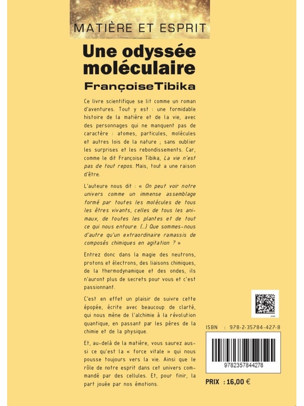 Cet ouvrage propose une réflexion profonde sur la matière, la conscience et leur interdépendance, combinant rigueur scientifique et ouverture philosophique. L’auteure s’appuie sur des concepts de la physique quantique, de la biologie moléculaire et de l’alchimie pour interroger la nature fondamentale de la matière, ainsi que ses implications sur notre existence et notre conscience. L’ouvrage débute par une réflexion sur la dualité apparente entre l’esprit et la matière. Évoquant la dualité onde-particule pour illustrer les propriétés mystérieuses des atomes, Françoise Tibika met en évidence que nous sommes autant soumis aux lois immuables de nos molécules qu’aux aspirations élevées de notre esprit. Elle s’intéresse ensuite aux découvertes scientifiques qui révèlent que les différences entre la matière vivante et la matière inerte s’estompent à l’échelle atomique. Elle souligne l’universalité des énergies qui animent les deux types de matière, réfutant la notion d’« énergie vitale » qui est et fut véhiculée par certaines traditions. L’alchimie, en tant que précurseur de la chimie moderne, occupe une place importante dans cet ouvrage qui explore également les lois fondamentales de la matière et leur impact sur la dynamique universelle, y compris sur nos interactions quotidiennes. Au final, ce livre invite les lecteurs à dépasser les limites des connaissances scientifiques actuelles pour envisager une compréhension plus holistique de l’univers.